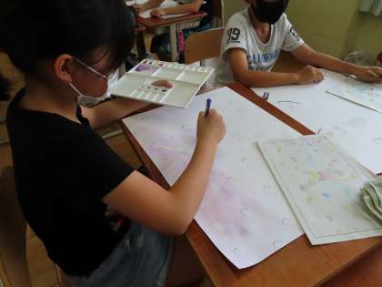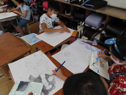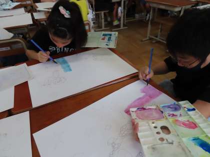 絵の具を混ぜ合わせてオリジナルカラーを作り,筆づかいを工夫して塗っています。絶妙なグラデーションを表現している子もいました。