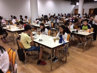 園内を一周してきた子どもたち。おなかもすいたようです。昼食は、カレーです。コロナ対策用の座席配置をしていただいています。
