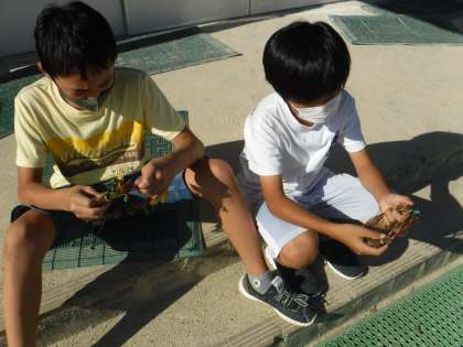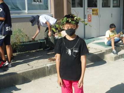 今日は、2校舎横のプランターの草抜きの後、アサガオのツルでリースを作りました!頭の飾りになったり、リースになったり楽しんで活動しました。