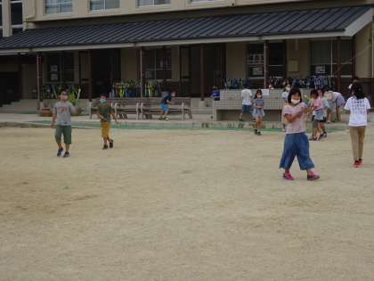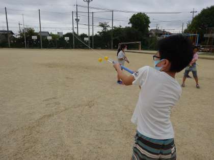 理科でとじこめた空気や水の実験をした道具を水でっぽうや空気でっぽうにして遊びました。誰が遠くまで水を飛ばせるかや,地面に水で絵を描くなどして楽しんでいました!