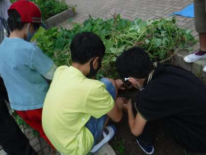 「ぼく!がんばるよ!」と1年生。6年生はぬいてる様子をパチリ!と写真におさめてくれました。まだいもが残っているかな?と土を掘っているとみみずや幼虫を見つけて「わあ!」といもほりから虫さがしになりました。