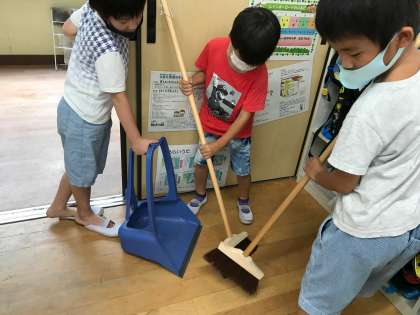 集めたゴミをちりとりにいれるのに苦戦していますが,上手にいれられました☆