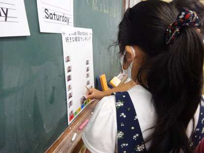 外国語活動の授業で,曜日の言い方を学習しました。今日は自分の好きな曜日を伝え合い,好きな曜日ランキングを作りました。1位は日曜日でした!