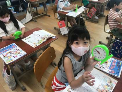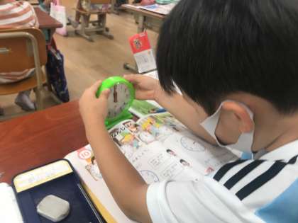実際に時計の針を動かして「3じ」「5じはん」などをつくりました。