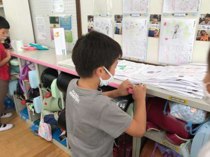 教室のロッカーやオルガン,棚などの高さや長さを測って友達のグループをくらべていました。
