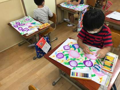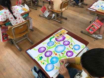 アサガオや小人,虫たちをかいた子どもたちです。