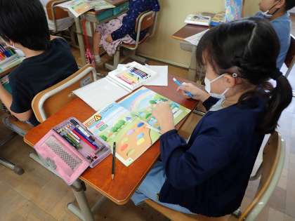 描いた虹を,英語で友だちと紹介し合いました。