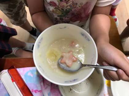 今日の給食のクリームシチューには星やハートの形になったにんじん「ハッピーキャロット」がはいっていました!