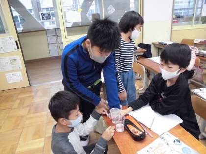 4年生の理科「雨水のゆくえ」の学習の様子です。