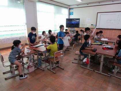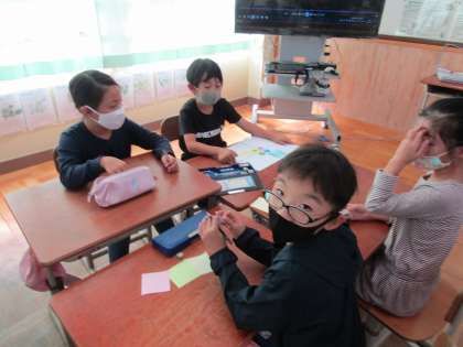 話し合いのツールを使って,付箋を動かしながらみんなの意見をまとめています。