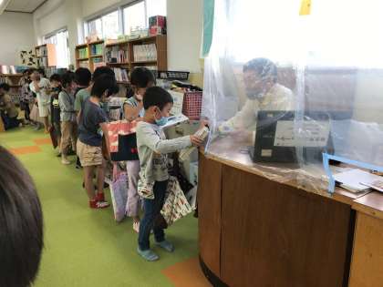 図書館の時間は,消毒をして図書館に行っています。