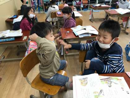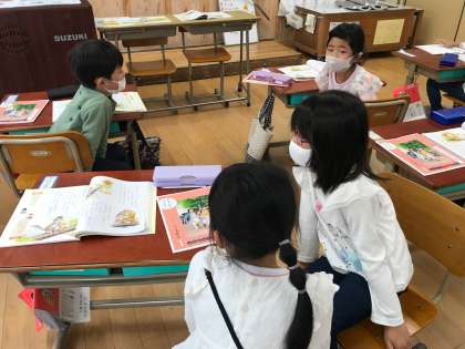 いじわるがたのしいと思っていたおおかみの気持ちがくまと出会ったことで変わっていく様子をみんなで考えました。