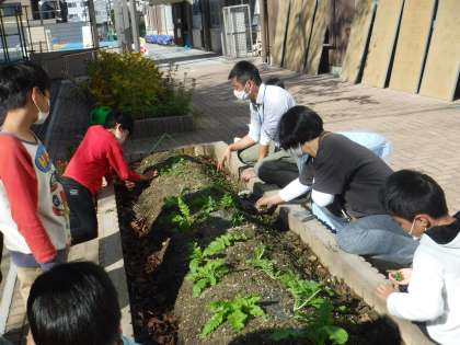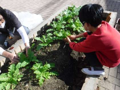 今,畑には大根が大きくなって来ました。いっぱい芽が出ているので間引きをしました。しっかりした芽を残して小さい芽を抜きます。みんなで気をつけて抜いた後,雑草も抜いておきました!