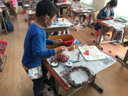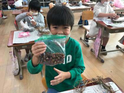 どんぐりや松ぼっくりをかざったり,モールや毛糸を巻き付けたりしていました☆