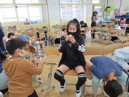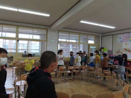 音楽が止まるまでは椅子取りゲームのような感じで,曲が止まったら椅子に座り,椅子の下にミッションが貼ってあるか確認します。