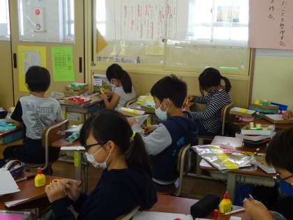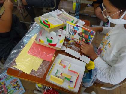 作品の柱になる部分には,自分の好きなキャラクターの服の柄をまねして描いている子がたくさんいて,みんな楽しく取り組んでいました。
