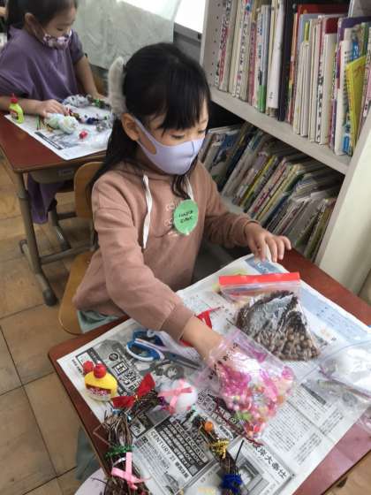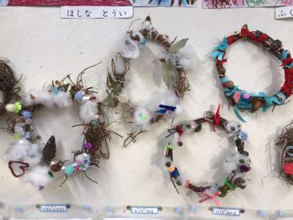 たくさんのかざりをかわいくつけてリースをつくりました。