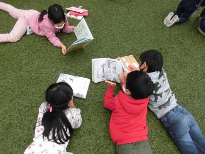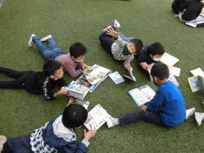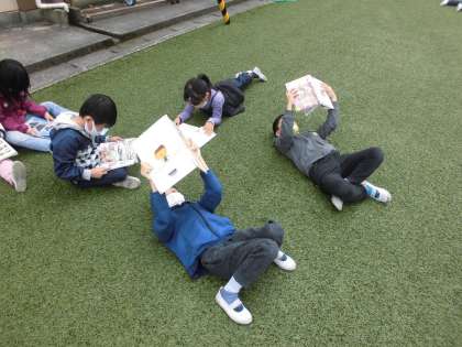 読書の秋ということで,芝生で読書をしました。