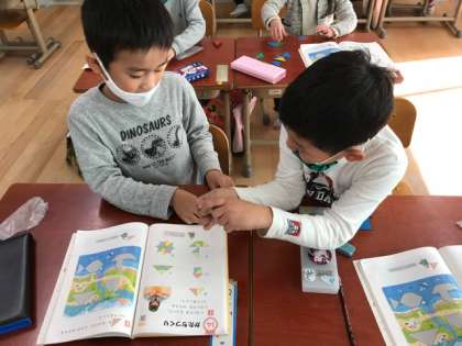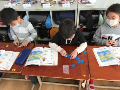 子どもたちは,三角の色板をつかって,いろいろなかたちを作っていました。