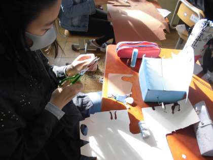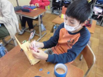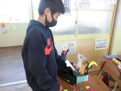 図工では,箱の周りを画用紙やモールなどで飾りつけていきました。