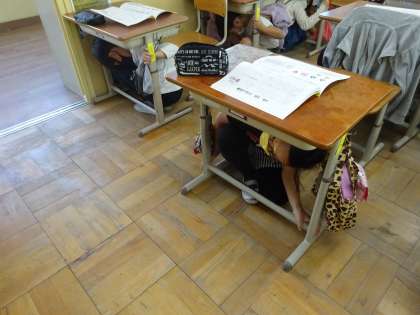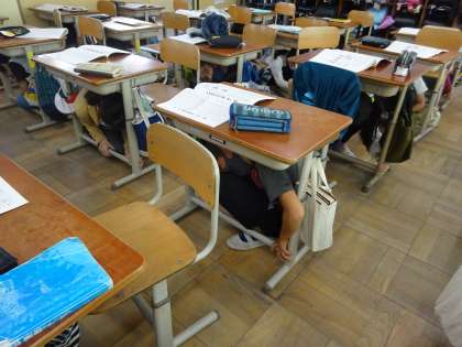 地震が起こったときに鳴る音を聞いたら,素早く机の下に隠れ,
