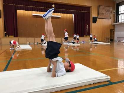 マット運動で背支持倒立をしました。