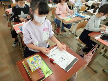 しっかりと導線を電池の+極とー極につなげて実験しました。