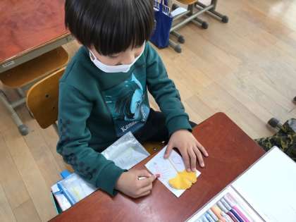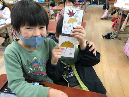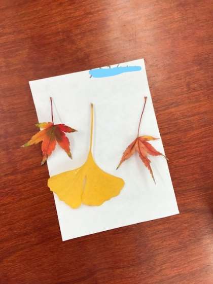 子どもたちが見つけた秋の葉っぱを使ってしおり作りをしました。