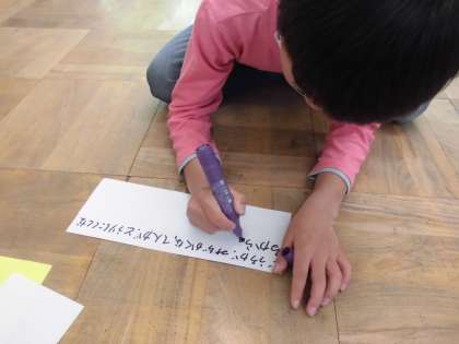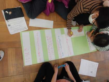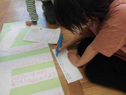 先日町たんけんに行き,インタビューしたことを画用紙にまとめました。