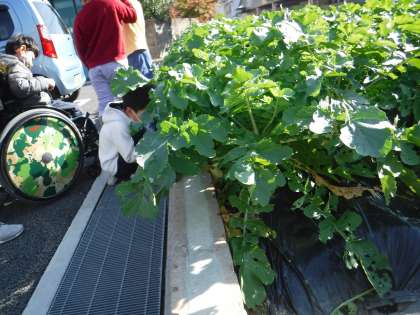 4日(金)に大きくなった大根を収穫します!「大きいな!」と嬉しそうです。そらいろ畑の大根は,葉っぱは立派です!収穫はまだもう少し時間がかかりそうです。