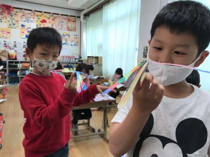 はさみとののりを上手に使うためにとんぼでやじろべえをつくりました。
