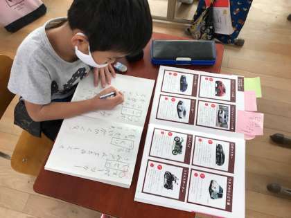 じどうしゃの本をたくさん読んで,しごととつくりをノートに書いています。