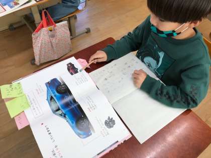 みんなで書いたものを図鑑にするために5つも6つも自動車のことを読んでいる子もいました!