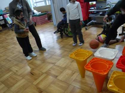 12月の誕生日会をしました!最初にコーンをピンにした大型ボーリング。うまく当てないとたおれません。1・2年生と3年生とコースをかえました。たおれたピンを3年生が力合わせて立てくれます。