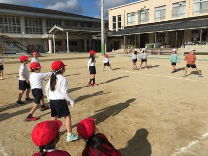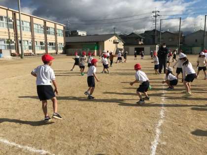 運動場の周りを走った後に,クラスを半分に分けて,それぞれのクラスで戦いました。