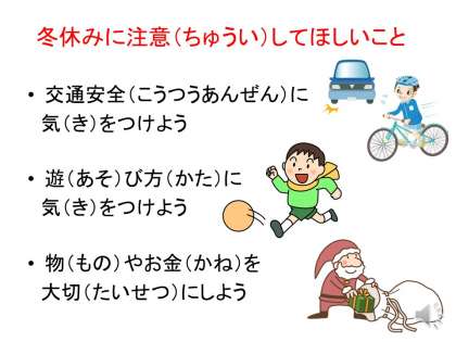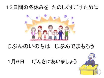 冬休みの宿題もありますが,楽しい冬休みにしてくださいね。