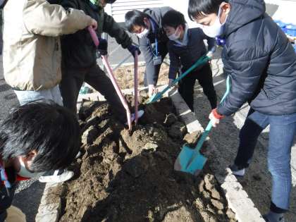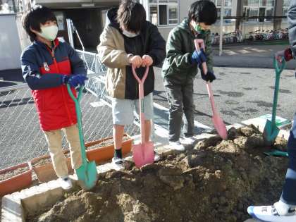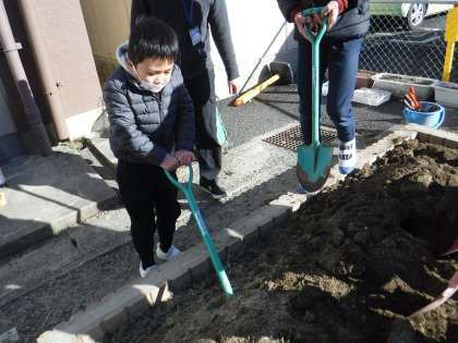 今日は,そらいろ畑を耕して土作り!と思ったら,凍っていて全くスコップが入らなくて「こんなん初めてや!」「かたいな!」と言いながらもみんながんばって掘り起こしていました。肥料も入れて何とか土を作ることができました。
