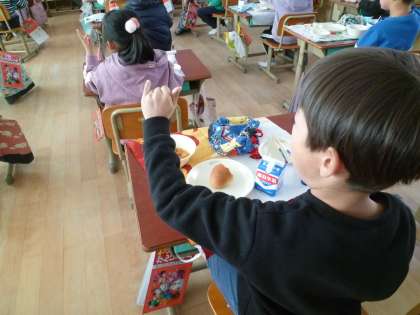 「おいしい」「いただきます」「ごちそうさま」「よくかむ」など,給食時間に使って伝えることができればいいですね。