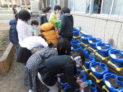 2年生は,生活科の授業で,12月にチューリップの球根を植えました。球根の頭が土からでないように,今日は少しだけ土をかぶせました。春にはきっと,色とりどりの花をさかせてくれると思います。みんなでいっしょにお世話をしています。