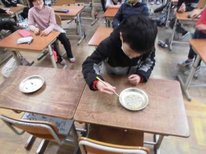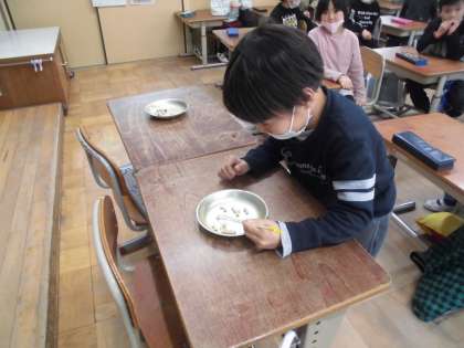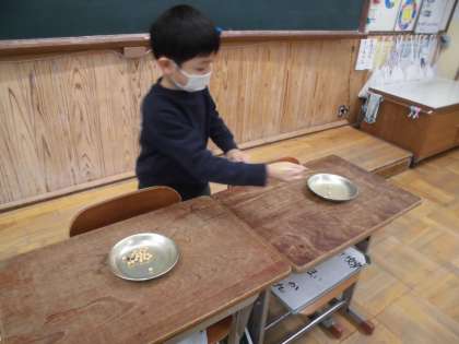 毎年恒例の豆つかみ大会が中止になったということで,クラスで豆をはしでつかむ練習をしました。