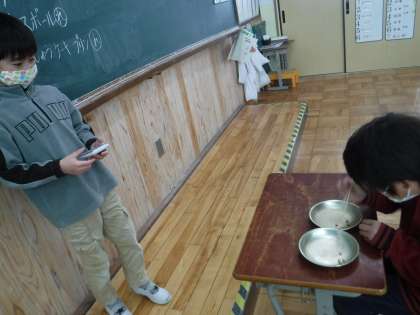 「豆つまみ」でおはしの持ち方の練習をしました。3年生や6年生がやる気満々でしていると1年生も「がんばる!」と一緒にしました。6年生は,大豆を10個つまむのにさすが!14秒でした。