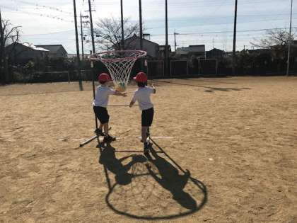 パスゲームは,対戦できないので,2人組,3人組をつくって,ボール運びゲームをしています。