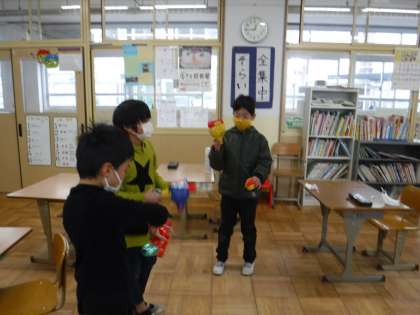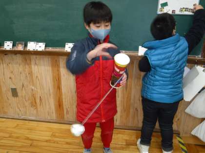 紙コップやペットボトルを使って「オリジナルけん玉」を作りました!6年生は,色合いを考えて静かに作っていました。ペットボトルを合体させて大きなけん玉のしたり,イチゴアイスの形のけん玉にしたり楽しいけん玉になりました。1年生は,3年生のお兄さんたちと「いっせいのーで!」とやり方を教えてもらいながら楽しんでいました!