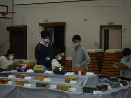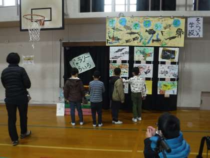 今日から始まった図工展に5時間め,そらいろと4年生で一緒に鑑賞しました。「そらいろギャラリー」を見てくれる4年生。6年生のオルゴールを「すごいね!ぼくも6年になったら作れるのかな。」と1年生。みんなで他の学年の作品を静かに鑑賞することができました。