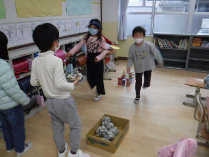 ボーリングは,新聞紙を丸めたボールをころがします。「おもしろい!」ともう1回並んでいました。全部のあそびコーナーにまわれて楽しかったです。