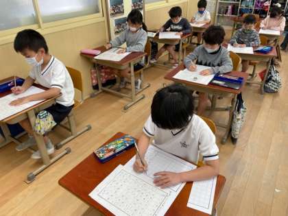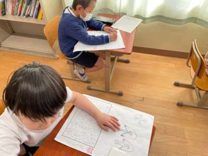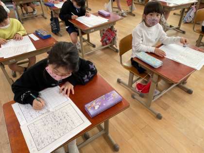 国語の学習で,1年生の生活を思い出して文章を書いています。