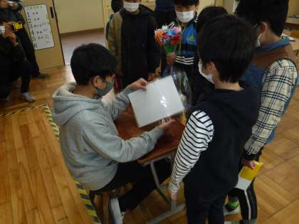 みんなからのプレゼントを渡した後は,6年生からもプレゼントをもらいました。1部は教室で行い2部は,体育館で「風船バレー」と「三角ベースボール」をしました。6年と楽しい時間が過ごせました。6年生から体育館前での靴の脱ぎ方や服のたたみ方などいっぱい教えてもらいました。いいことはどんどん引き継いでいってほしいです。