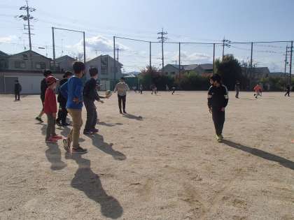 中間休みにはたくさんの人が運動場で元気いっぱいに走り回っています。5年生は「みんな遊び」が好きで,誰からともなく「みんなでドッジビーしよ!」などの声が上がり,一斉に運動場へ出て仲良く遊んでいます。
