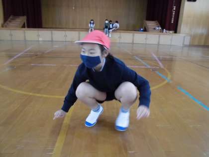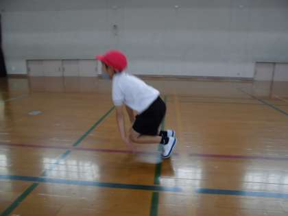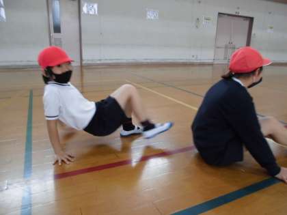 体育では,体ほぐしの運動で,いろいろな生き物になりきって体を動かしました。