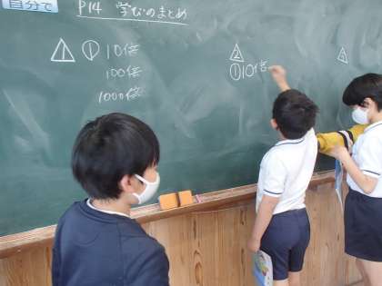 今週の算数は,「整数と小数」の練習問題から取り掛かりました。習ったことを生かして,答えを言うだけでなく解き方を説明する時間を大切にしています。